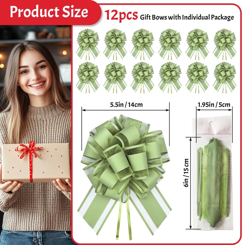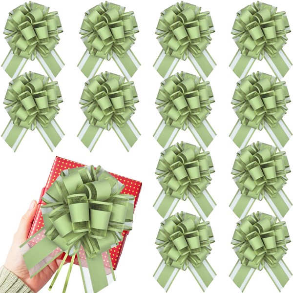 Yokodaza 12Pcs Sage Green Pull Bows for Gift Wrapping - Bean Green Large Ribbon Bows for Presents, Plant Bouquets, Rustic Wedding Decorations