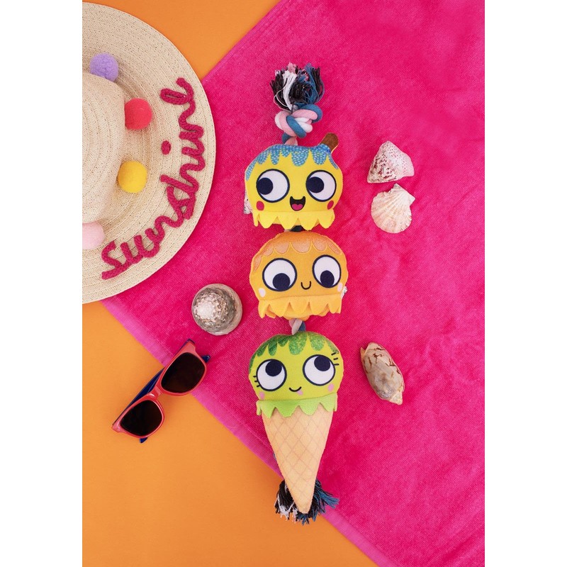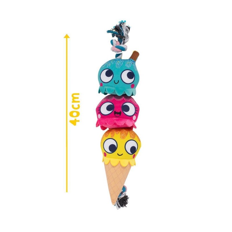 - Each toy features a delightful ice cream-inspired design, with three plush cone sections containing individual squeakers, all joined together by a durable rope for added fun. The unique design allows for versatile play, whether your pet prefers fetching, tugging, or simply snuggling with their new toy.