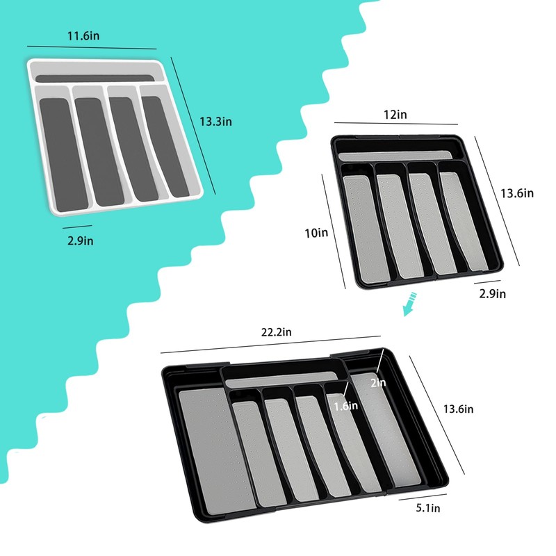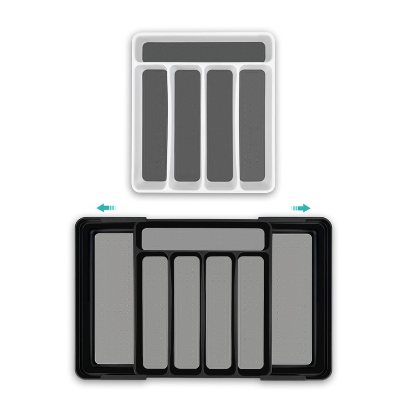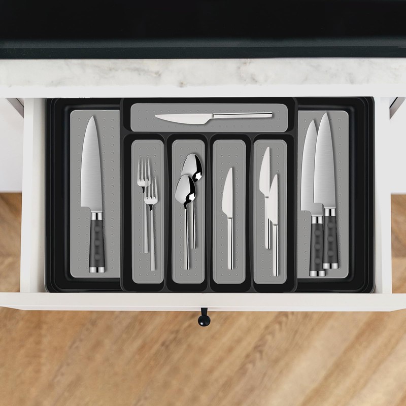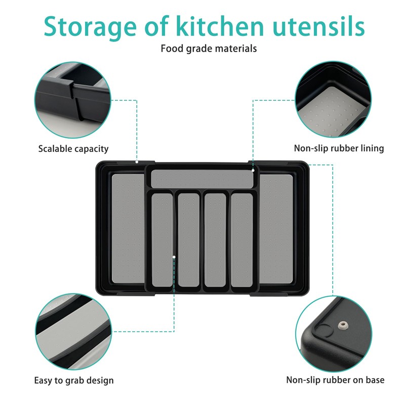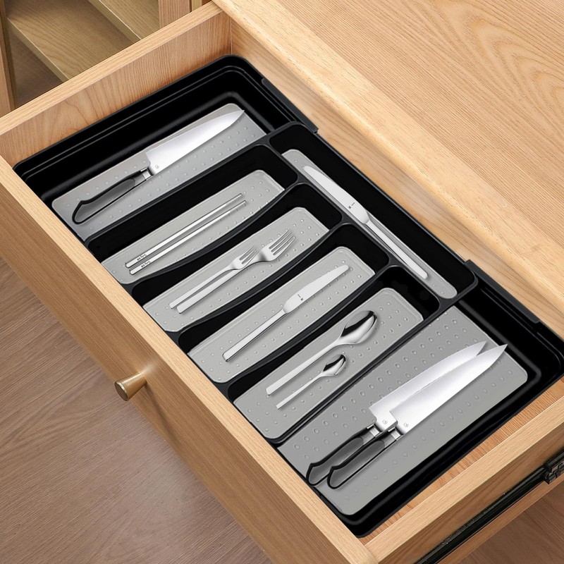 • 【Unique Design】: The extendable cutlery tray is designed to flexibly expand storage space according to the number of utensils, saving space while maintaining order. The slip-enhancing base inside the box ensures that even in a rush, you don't have to worry about a messy drawer; every detail contributes to drawer tidiness. The base is equipped with a sturdy PP material slip-enhancing pad, a slip-enhancing base design that's like giving cutlery "non-slip shoes," avoiding falls and enhancing the user experience.