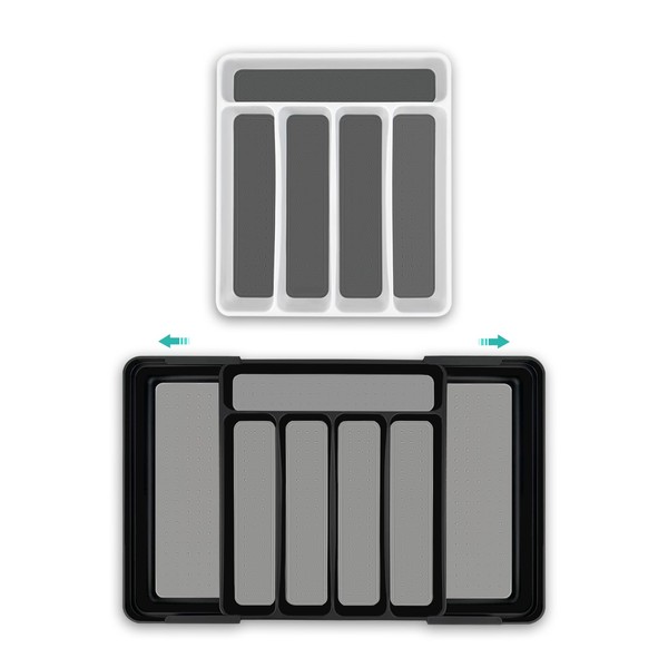 • 【Ample Storage】: Selected two-piece cutlery set, with dimensions of 28.5×32.5cm and 30×33.5cm, is crafted from high-quality PP+TPR material. Available in sleek white, classic black, the minimalist design complements contemporary home decor. The five-compartment design is lidless and stackable, making it easy to organize a variety of cutlery.