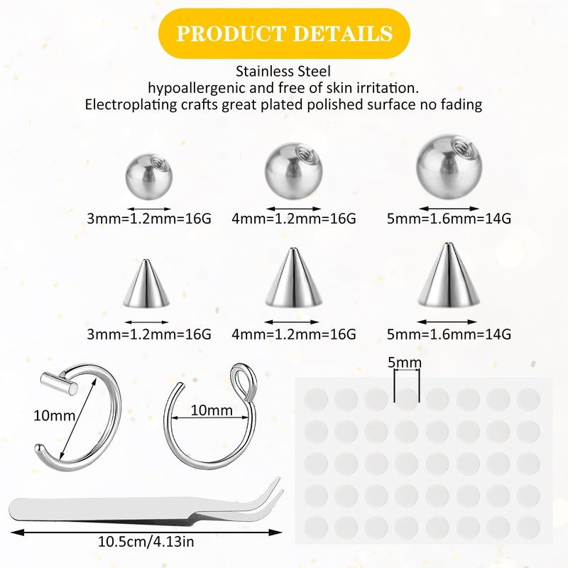 Yolev 54 Stück Fake Piercing Kugel Nasen Lippenohrringe 3 mm 4 mm 5 mm Stahlfarbe Fake Nose Ring Gefälschtes Augenbrauen Fake Septum Piercing Ohr mit Aufkleber Fake Piercings Einfach zu Tragen