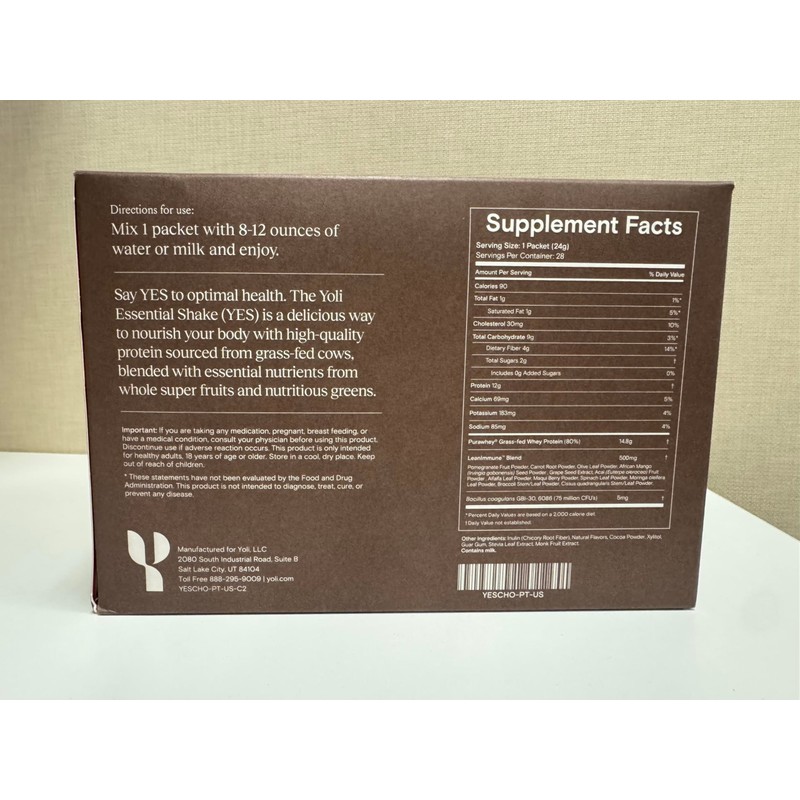 Yoli® Essential Shake YES Whey Protein Powder from Grass-Fed Cows - 28 Packets, Chocolate