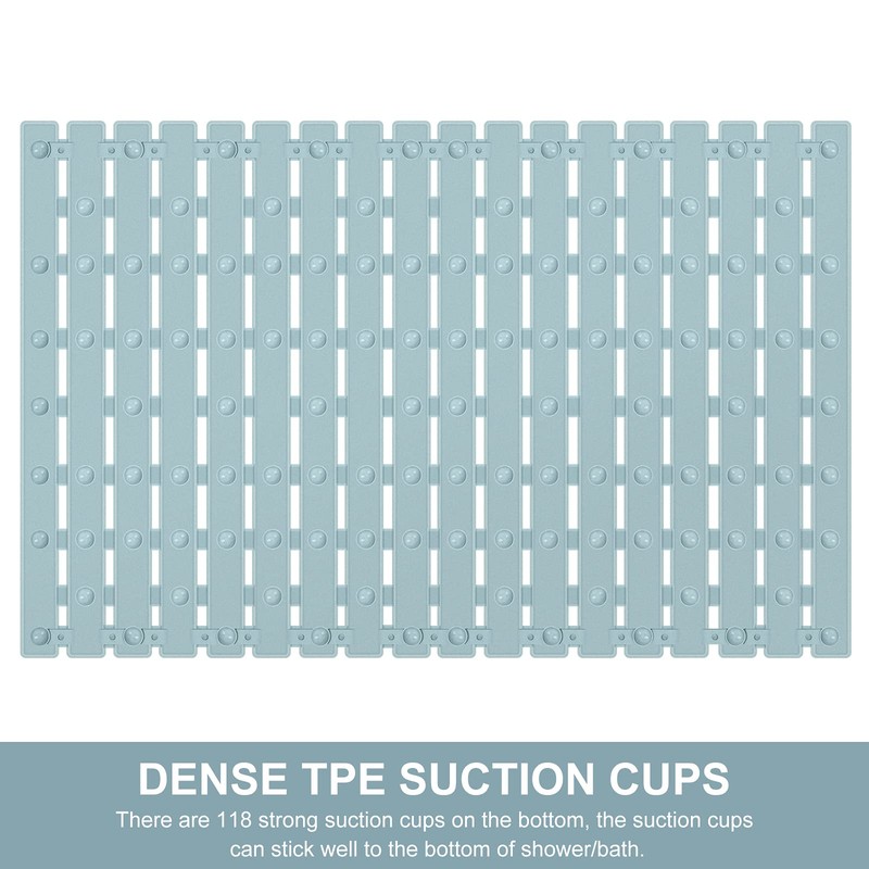 - PERFECT DRAINAGE SYSTEM: The stripe design is elevated with drain hole slotted panels allowing the water/soap/hair/air/etc flow underneath and not accumulate around your feet is wonderful, it make the mat keep clean , roll it up and stand it on the edge can quick dry