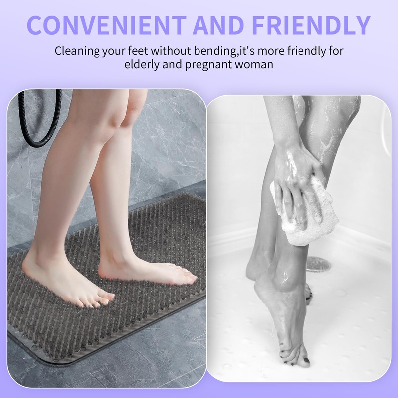 - Clean Your Feet Deeply - The Shower Foot Scrubber Mat with hundreds of scrubbing bristles to deeply clean your feet,exactly reach the hard-to-get-into areas between toes. It could also remove calluses, dead skin, or other annoying foot skin problems.No need to bend and keep a balance to clean feet. The best choice for lazy people.