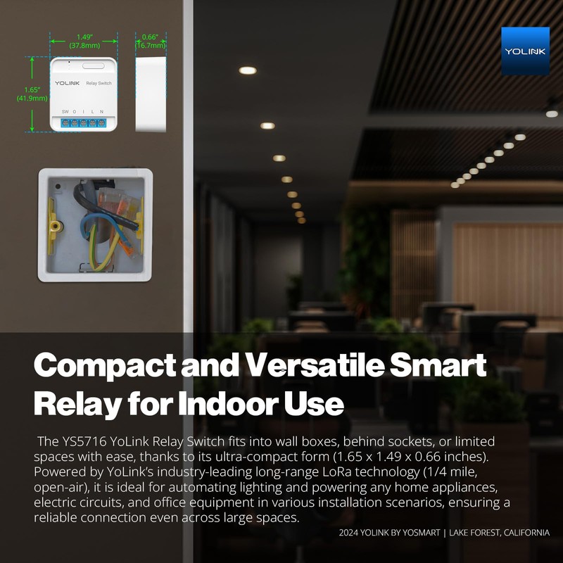 - Compact and Versatile Smart Relay for Indoor Use: The YS5716 YoLink Relay Switch fits into wall boxes, behind sockets, or limited spaces with ease, thanks to its ultra-compact form (1.65 x 1.49 x 0.66 inches). Powered by YoLink’s industry-leading long-range LoRa technology (1/4 mile, open-air), it is ideal for automating lighting and powering any home appliances, electric circuits, and office equipment in various installation scenarios, ensuring a reliable connection even across large spaces.