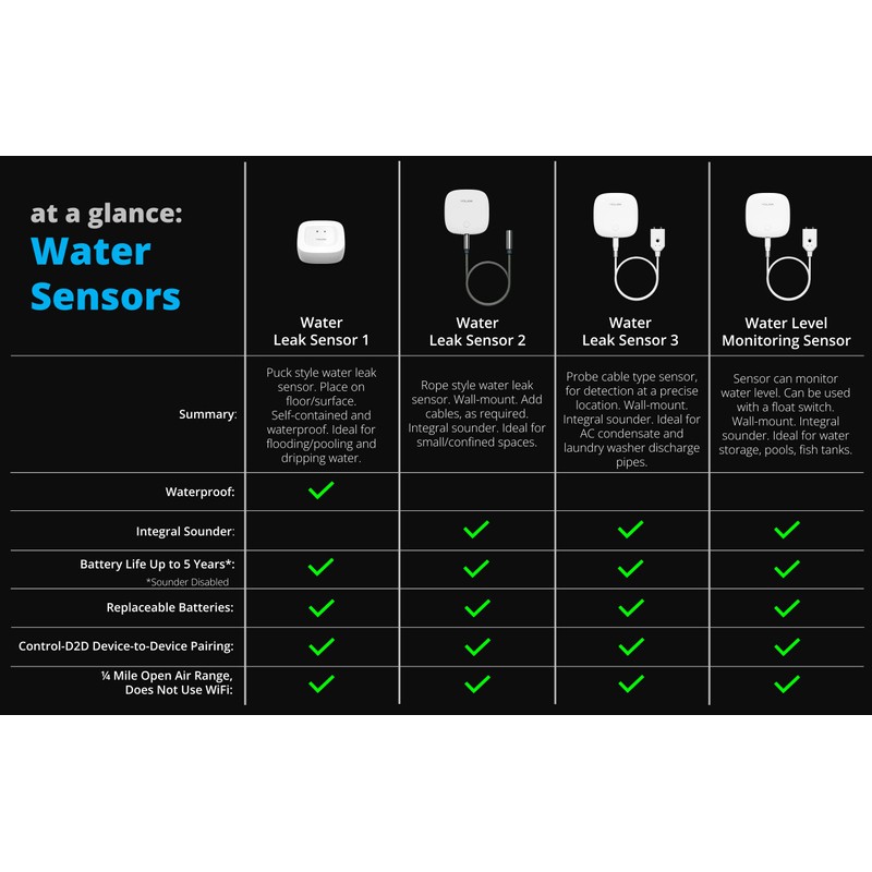 - Smart Water Leak Detector: Monitor critical locations at risk of flooding, and be informed immediately of the presence of water, preventing costly repairs; Smart Water Level Monitoring: The sensor may be configured for water level monitoring – be informed when water is no longer present or when water levels recede. Monitor water supplies for pet care, house plants, gardening and more