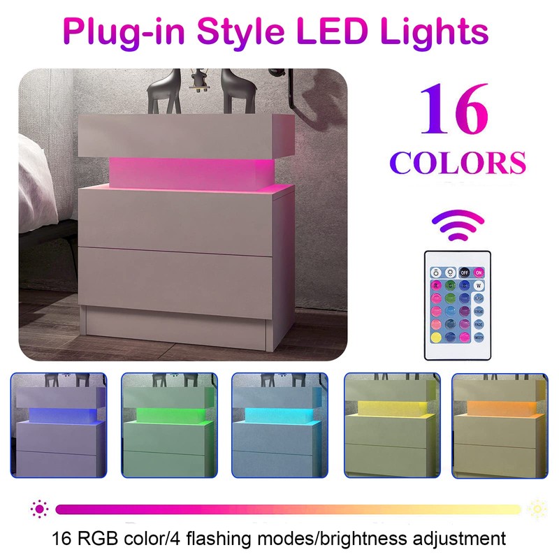 - 【Modern 2-Drawer LED Nightstand】Inspired by modern style, this drawer nightstand adds a touch of chic beauty while providing convenient storage space for your bedroom, hallway, living room and more. The LED nightstand has 16 RGB color, 4 flashing modes and brightness adjustment. Colorful lights make your bedroom more attractive. With clean lines and a rectangular high gloss body, the space-saving side table will easily blend into your existing decor. This bedroom nightstand has a modern minimalist elegance and gives it a stylish feel