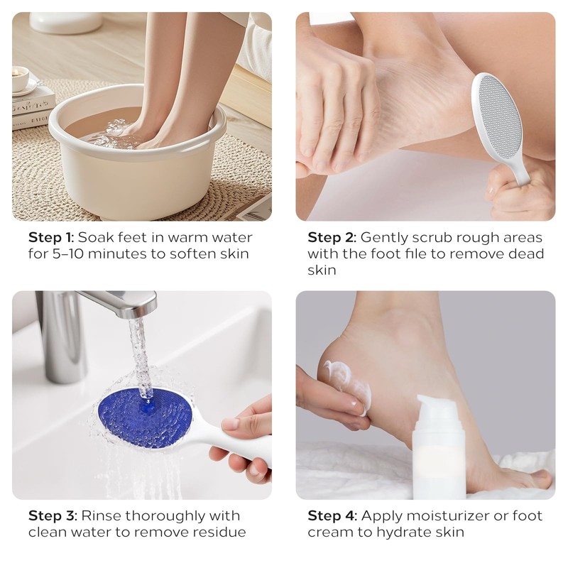 - Dual-Action Design (2-in-1): Crafted with advanced nano-glass etching technology, this dual-sided foot file combines precision and durability. The reinforced glass structure resists deformation for long-lasting use. Coarse Side: targets stubborn calluses and dead skin with controlled abrasiveness. Smooth Side: Features circular micro-textures for gentle dead skin removal and leg hair reduction.