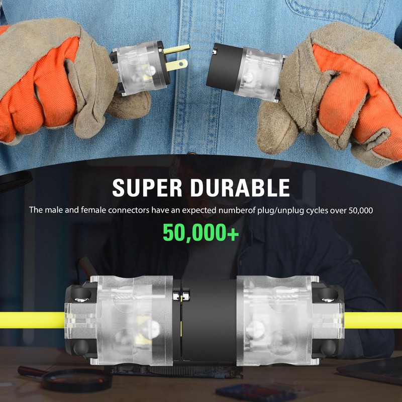 - 🔧 Quick & Secure Installation Design Features a dimpled body for enhanced grip, transparent terminal covers for visual inspection, and quick-thread screws for effortless assembly. Compatible with 18-12 AWG extension cord ends male and female, ensuring a secure connection for generators, welding equipment, and sump pumps.