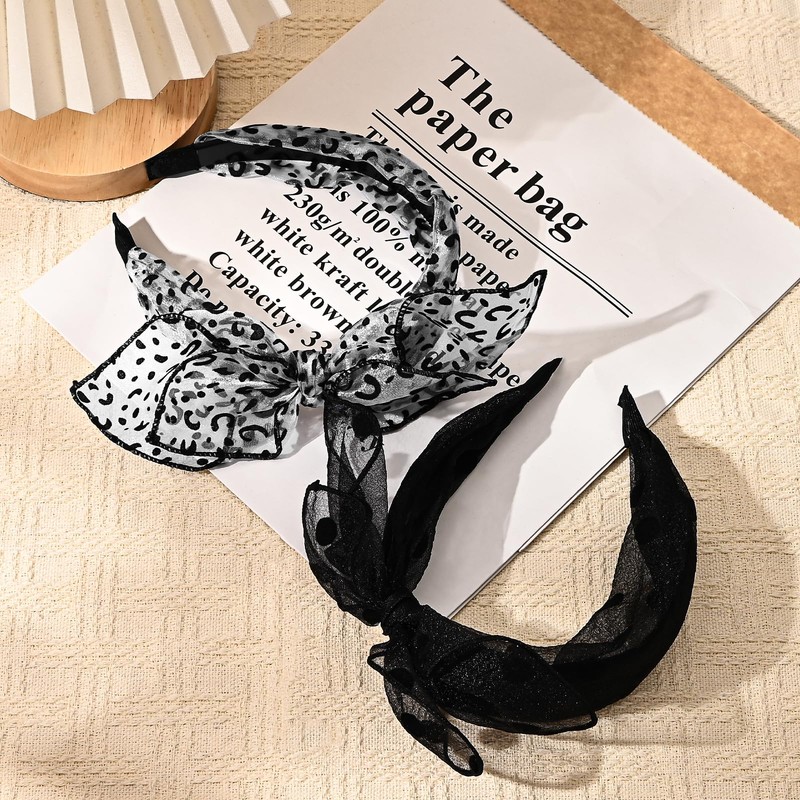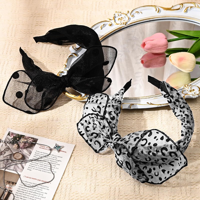 Yonchic 2-Piece Mesh Bow Polka Dots & Leopard Printed Headbands for Women & Girls, Fashion Side Double Layer Knotted Tulle Headband, Elegant Non Slip Knot Wide Hair Accessories (Black & Gray)