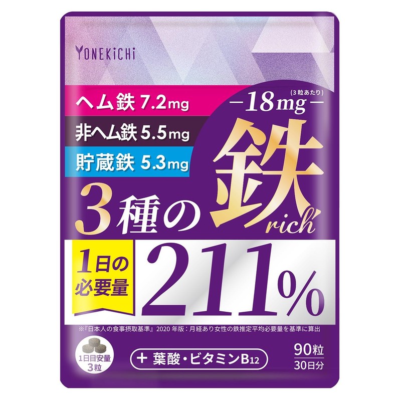 YONEKiCHi 鉄 サプリメント 鉄18mg 3種の鉄リッチ 鉄分 ヘム鉄 フェリチン鉄 葉酸 ビタミンB12 90粒 30日分