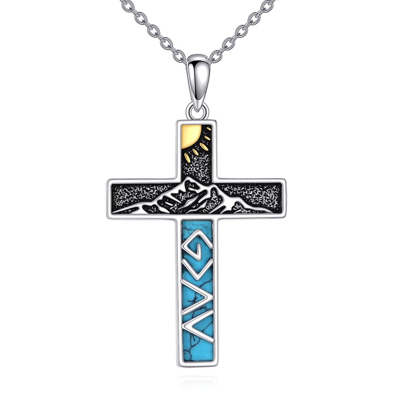YONFQE Gott ist größer als Höhen und Tiefen, Halskette 925er Sterlingsilber mit türkisfarbenem Kreuzanhänger, Schmuck für christlichen Glauben, Geschenke für Frauen und Männer