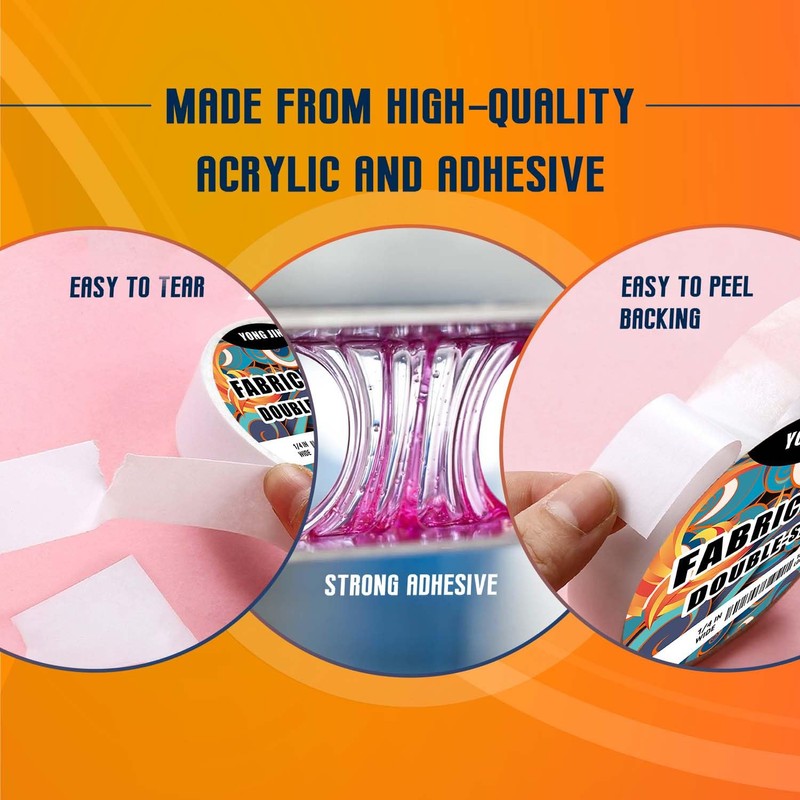 - Easy to UseWith our double-sided tape, there's no need for sewing or ironing.Easy to use, easy to peel. Simply cut to the desired length, peel off the protective backing, and firmly press onto the fabric. This tape is suitable for temporary fabric attachment, making it an ideal choice for crafts and home repairs.