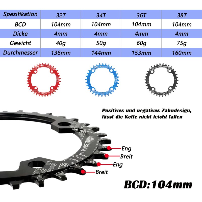 - ✔️PRODUCT SPECIFICATIONS:BCD:104mm Shape: round Color:Black,Red,Blue Straight thickness: 32T/136mm, 34T/144mm, 36T/153mm, 38T/160mm. Weight: 32T/45g, 34T/55g, 36T/60g, 38T/70g Packaging information: bicycle chainring x 1, single chainring screw x 4.