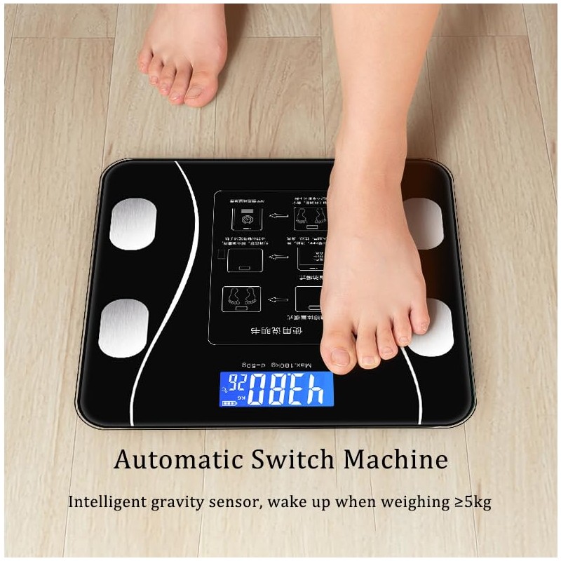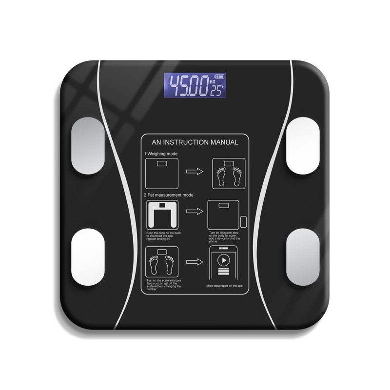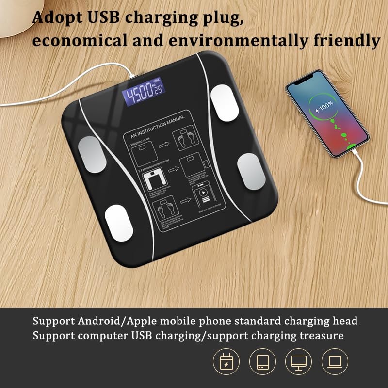SpecificationProduct Name: Smart Body Fat ScalePower supply mode: USB chargingConnection mode: Bluetooth 4.0Display mode: night vision backlit large screenProduct size: 260X260x23mmWeighing range: 0.2kg-180kgDisplay size: 58X23mmScale surface material: high-strength tempered glassBoot mode: >5kg automatic bootWeighing unit: kg