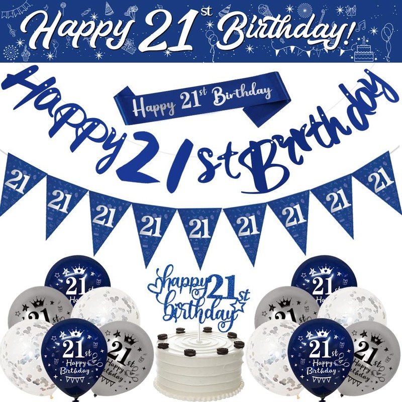 Product descriptionHappy 21st Birthday DecorationsThe birthday decoration with silver blue as the theme color whichcreates a warm and happy atmosphere for your 21st birthday.Package list:1x 9ft banner1x birthday bunting1x triangular bunting1x birthday sash1x birthday cake topper4x confetti latex balloons4x navy blue balloons4x sliver boons.When you receive the blue balloon, it looks like black before it blows up, but after you blow it up, it turns blue. So you don't have to worry about receiving the wrong balloon, just blow it up and it will turn blue.Safety WarningNot suitable for children under 8 years. For use under adult supervision