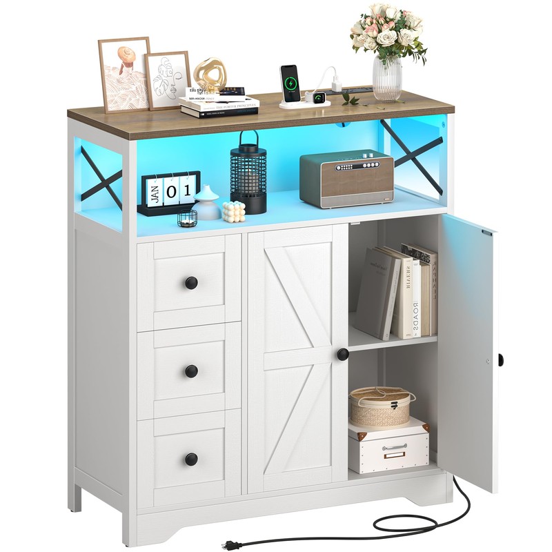 Yoobure Kitchen Buffet Storage Cabinet with Doors and Shelves, LED Pantry Cabinet with Drawers, Farmhouse Coffee Bar with Power Outlet,Wood Sideboard for Entryway Living Room, 32.3" x 14" x 37.6"