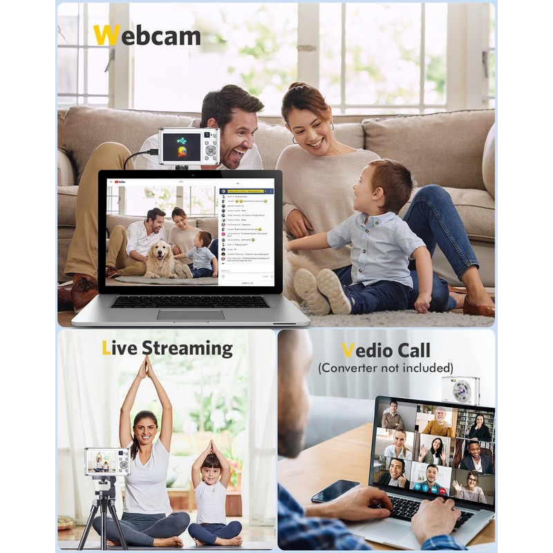 - [Webcam & Pause Function]-This vlogging camera supports video mode, built-in microphone and anti-shake function, connect to computer via USB cable and used as webcam for video calls and live streaming, so you can share your wonderful moments to social media. YouTube Camera for vlogging has an excellent pause feature that allows you to pause while recording your video. Blog portable camera perfect for recording happy moments with friends, family members, indoors/outdoors