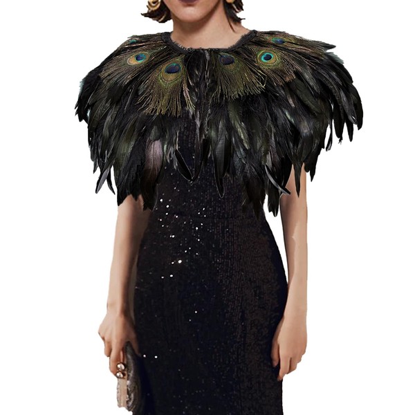 Yoodeet Handmade Feather Shawl Peacock Feather Cape Collar, Black Feathers with Iridescent Eyes, Gothic Costume Accessory Versatile Headpiece Bridal Accessory