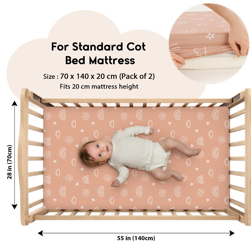 - 2 fitted sheets: each fitted sheet set contains 2 sheets, you can easily change the sheets. Suitable for standard cot mattresses measuring 70 x 140 cm and a height of 7 to 15 cm. Unisex design is suitable for both girls and boys.
