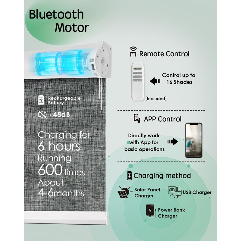 - 【Rechargeable Battery Motor】With Bluetooth motor, electric blinds with remote can be seamlessly controlled via the Yoolax Home App without needing a Smart Bridge. For integration with Alexa, Google Assistant, and more, a Bluetooth Hub/Bridge is required. Featuring a built-in rechargeable battery, our remote window shades can be used for 4-6 months once fully charged. Pair them with our solar panel for an eco-friendly power solution that's as smart as it is efficient