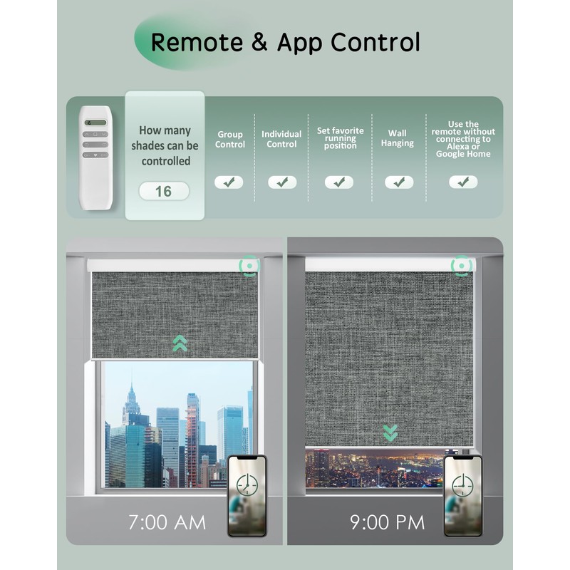 - 【App & Remote Control】Say goodbye to manual operation and enjoy the convenience of controlling your blinds with either the app or the remote. Yoolax Home App allows you to control up to 3 blinds, while the 16 Channel Remote can control maximum 16 blinds. Enjoy the benefits of motorized shades at the cost of traditional manual shades—making smart home upgrades both practical and affordable