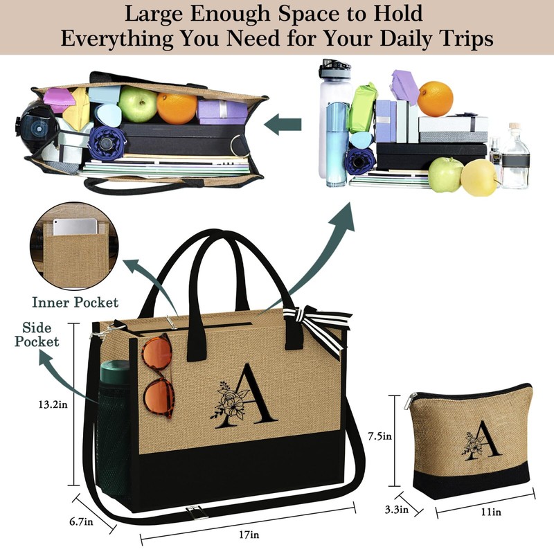 - 【COSMETIC BAG & MONOGRAM EMBROIDERY】: You receive a Jute Beach Bag and a Makeup Bag. Makeup Bag is large enough to hold your daily cosmetics. Rose letter embroidery on bag is high-density embroidery. You can choose the letter that represents your name