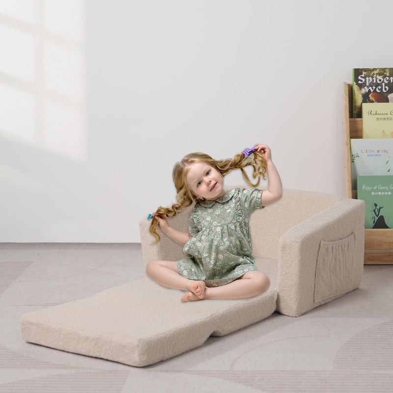 Yoonnie room Foam Kids Sofa Chair, 2 in 1 Convertible Sofa toToddler Couch, Baby Sofa Bed,Soft Toddler Chair, Foam Filling and Teddy Cover, Kids Couch for Boys and Girls (W56cm) (Beige)