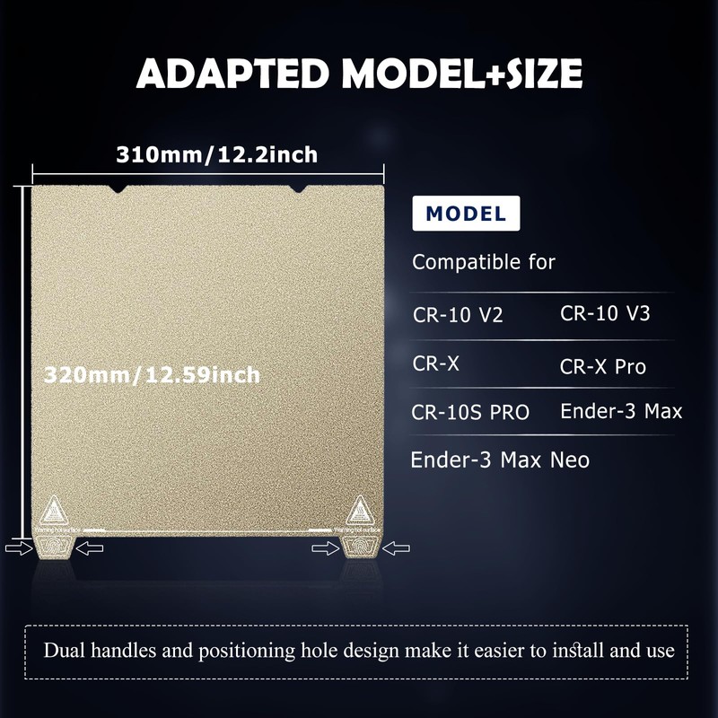 - ??Wide compatibilityThe size of the print bed is 310 x 320 mm. Please confirm the size of your 3D printer. After you install the print bed, please realign it to improve the printing effect. It is suitable for CR10/CR10S, CR 10S Pro/V2/V3, Ender 3 Max/S1 Plus, AnyCubic Mega X, X40 IDEX/X40 V2, KP5L, S8 Pro/Plus, TL-D3 Pro, Twotrees SP-5 and other 3D printers.