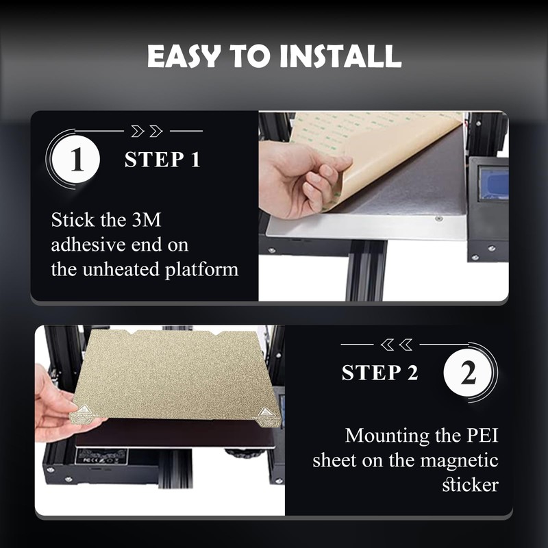 - ?? Easy installation: The Ender 3 PEI pressure plate consists of two parts, a flexible steel platform with textured PEI on both sides and a magnetic base with adhesive on the back. Simply attach the magnetic base to your heating bed and place the flexible steel platform with PEI surface on it.