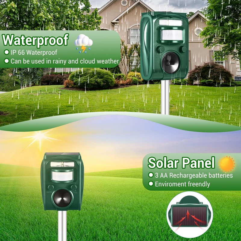 - Waterproof&Solar:Efficient solar panel charging, continuous operation, no need to replace batteries. IP65 waterproof and hard ABS material can resist monsoons and snow, providing long-lasting protection for your garden and farm