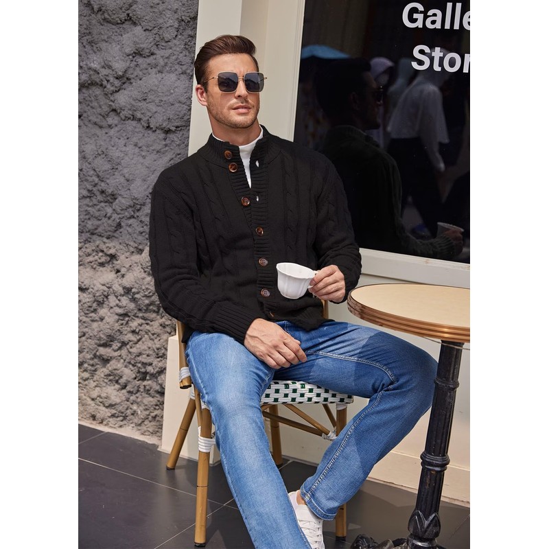 YOPP Mens Long Sleeve Stand Collar Cardigan Sweaters Button Down Cable Knitted Sweater Black,XL