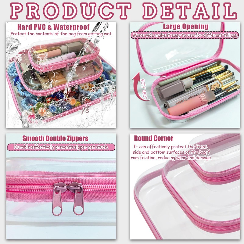 YOQIVEXU 3 Pcs Clear Hard Zipper Case, Hard Shell Plastic Clear Organizer Bag, Transparent Makeup Pouches, Portable Box for Travel Toiletries Storage Bins (Pink, Multi)