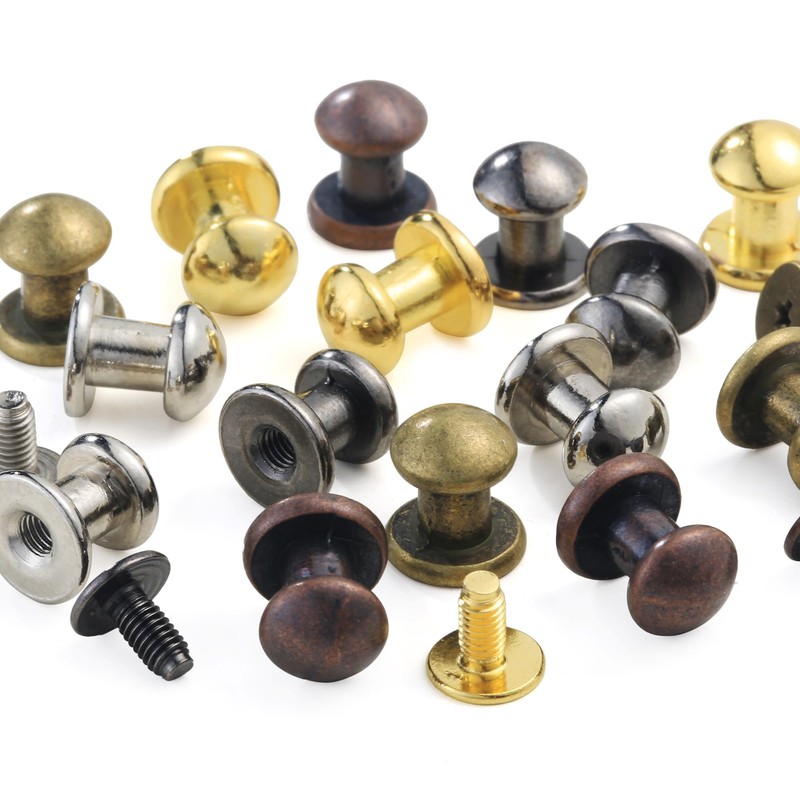 • Size and Color: Stud height: 10 mm (13/32"), round head diameter: 8 mm (5/16"), stud base diameter: 9 mm (11/32"), height of screw: 6 mm (15/64"); Color: Assorted with silver, gunmetal, gold, bronze and antique copper
