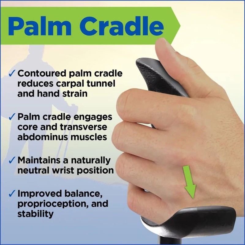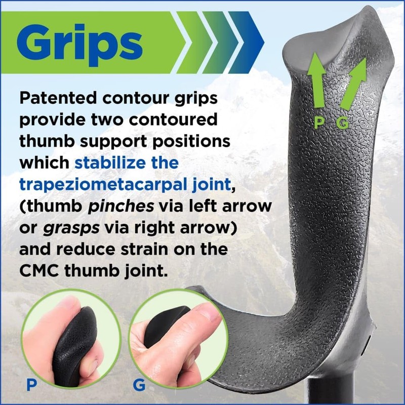 - PATENTED GRIP -BETTER BALANCE, LESS STRESS: Two contoured thumb positions making gripping a breeze. Thumb grasps around the sides of the grip and the ability to rest your thumbs on the top in a "pinching" position improves proprioception and reduces stress on the CMC joint over a traditional grasping position, and is the best in class hand support for the biaxial saddle joint. Durable round rubber tips are also more stable than Nordic or thin tips.
