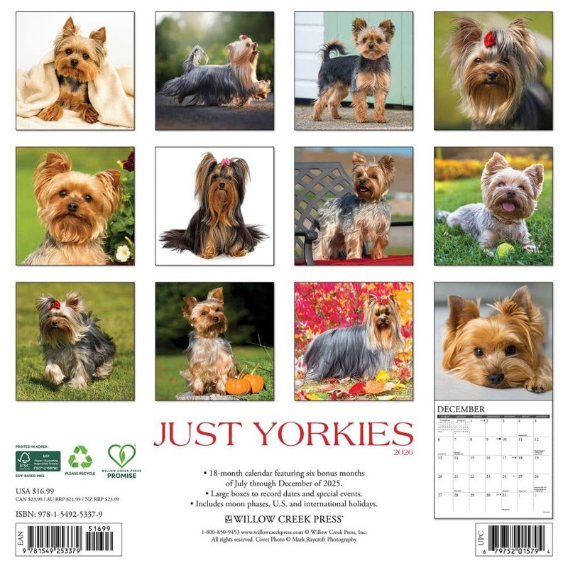 - - Yorkshire Terriers ? monthly full-color photographs of Yorkies for breed appreciation all year. - Wall format ? large grid layout for easy scheduling and note-taking throughout each month. - Ideal size ? measures 12" x 12" closed for convenient wall display in home or office. - Stapled binding ? securely bound with fsc certified paper for durability and eco-friendly use. - Full coverage ? 18 Month calendar starting 5/31/2025 with us and international holidays.