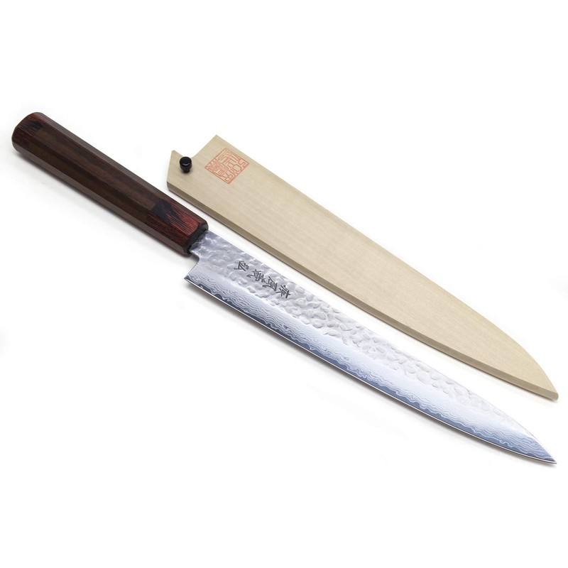 **Knife Features** → Blade Material: VG-10 Stainless Steel →Edge Angle:Double Edged →Grade:Damascus →Handle Shape: Octagonal →HRC:60 →Knife Style: Sujihiki →Saya Cover: Natural Magnolia Wood →Stain Resistant:Yes Forged and hammered with 46 layers of steel in the Damascus tradition with a VG-10 Core, the VG-10 Hammered Damascus Series has been a perennial best seller, combining performance, beauty, and extraordinary value. The Sujihiki is a slicing knife with a long narrow blade that smoothly slices through meat or vegetables and preserves the integrity of each ingredient’s freshness.The Sujihiki slicer can carve and fabricate large roasts and other meats and fish, and can be used for thinly slicing other ingredients such as cucumbers or smoked salmon. From slicing filets of fish fresh from the fish monger to carving a roast chicken straight from the oven, even the simplest tasks are elevated with a handcrafted knife that is as beautiful as it is functional. This knife is complimented with a traditional Japanese Wa-style handcrafted Octagonal Handle that is lightweight and ergonomically welds to the hand for seamless use. A protective wooden sheath called a Saya is included, which protects the knife and adds to its appearance when not in use. The hammered texture of the blade eliminates friction and keeps food from sticking to the blade. Every knife from Yoshihiro is handcrafted by master artisans creating a unique one-of-a-kind work of art. Perfect for both commercial kitchens or at home! Traditional Japanese knife making values a sharp edge, which requires attention and care. Sharpening and honing should be done with only water whetstones. Hand wash and dry only, and do so immediately if working with acidic ingredients. Do not use on objects such as bones, nutshells, and frozen foods.