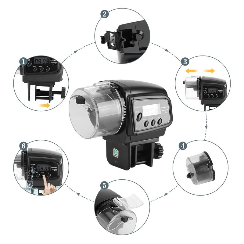- 【Easy to Add Food】: This auto fish feeder adopts top opening design for quickly and easily adding feed, so you can easily increase or decrease the amount of food dispensed without taking down the food bucket. Because of the 360°rotation of the pedestal of this automatic fish feeder, you can rotate it to the satisfying position after it is installed.