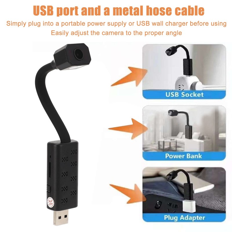 Convenient Set-up: This surveillance camera is effortlessly installed using a USB port and a flexible metal hose cable. Simply connect the camera to a portable power source or a USB wall charger, and adjust the camera angle with ease using the metal hose cable.