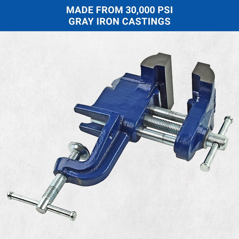 - PORTABLE VISE: The Yost Vises COV-3 3-inch Clamp-On Vise is made from 30,000 PSI Gray Iron Castings. It has a plated steel screw and handle and steel double guide rods. Capable of clamping up to 3/8 inch depth pipes.