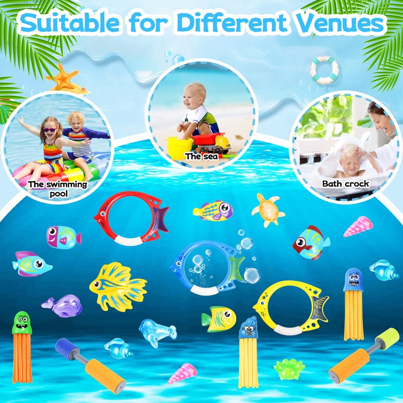 - 23-piece diving toy set: includes 3 fish shaped diving rings, 2 foam water pistols, 6 small fish shaped diving toys, 8 animal gemstones, 3 octopuses and 1 bag. This complete diving toy set allows your children to dive happily and enjoy the summer.