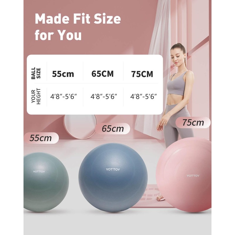 - Our workout balls for exercise features a surface design that is exclusive to our YOTTOY brand, incorporating an explosion-proof thread for double the strength and added durability. Additionally, we have improved the anti-slip texture to ensure a strong grip, even when sweating. With its sturdy construction, you can trust that our fit ball won't pop out during your workouts. Elevate your yoga practice today with our top-of-the-line sitting ball!