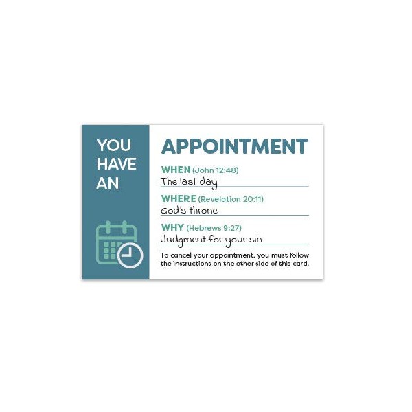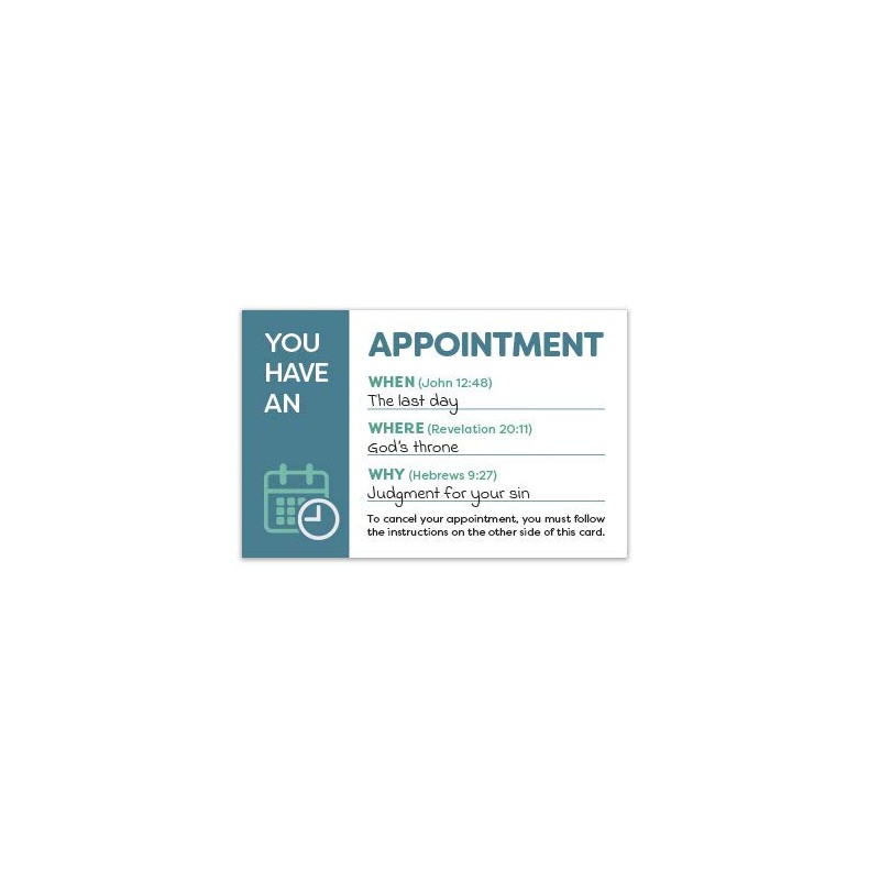 How can you cancel your appointment for judgment for sin before God someday? Only by accepting Jesus a your Savior. Modeled to look like an appointment card, this mini tract presents a powerful message!