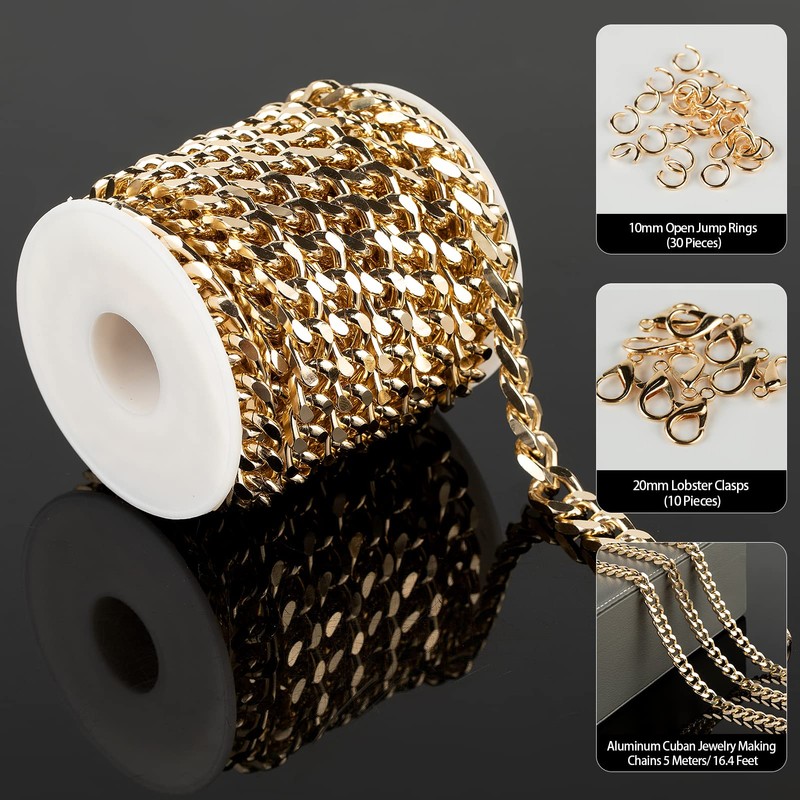 - Package Includes- The jewelry making supplies include 5 meters gold plated chain roll with 10pcs lobster clasps and 30pcs open jump rings. Enough for diy making your own personalized necklace bracelet jewelry projects with these jewelry accessories