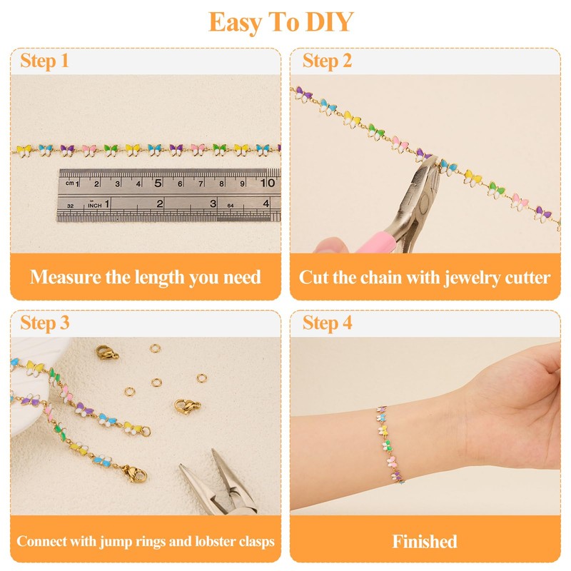 • Wide Use Chain- The cute colorful enamel butterfly chain is great for diy jewelry like necklaces, bracelets, anklets, earrings, earrings, body chains, etc. Also can be used as clothing chains, hat chains, decoration chains for any place. Whether you are a craftsman or jewelry designer, this chain roll is your ideal choice.