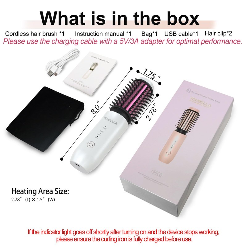 Youbella Cordless Hair Curling Iron Brush This rechargeable curling iron cordless offers versatile styling with curling, straightening, and negative ion care. The cordless hair brush straightener is compact, travel-friendly, and provides 45+ minutes of use for perfect styles on the go. 【FQA】 Q: Can this product be taken on an airplane? A: Yes, the product can be carried in your carry-on luggage. Q: Why the product does not heat up? A: Ensure the product is fully charged. Wait until the flashing light turns solid before using it. Q: Why the product does not work? A: Make sure it’s fully charged and wait for the flashing light to turn solid before using. For longer, thicker, or coarser hair, it will take more time to style, requiring a longer operation time.