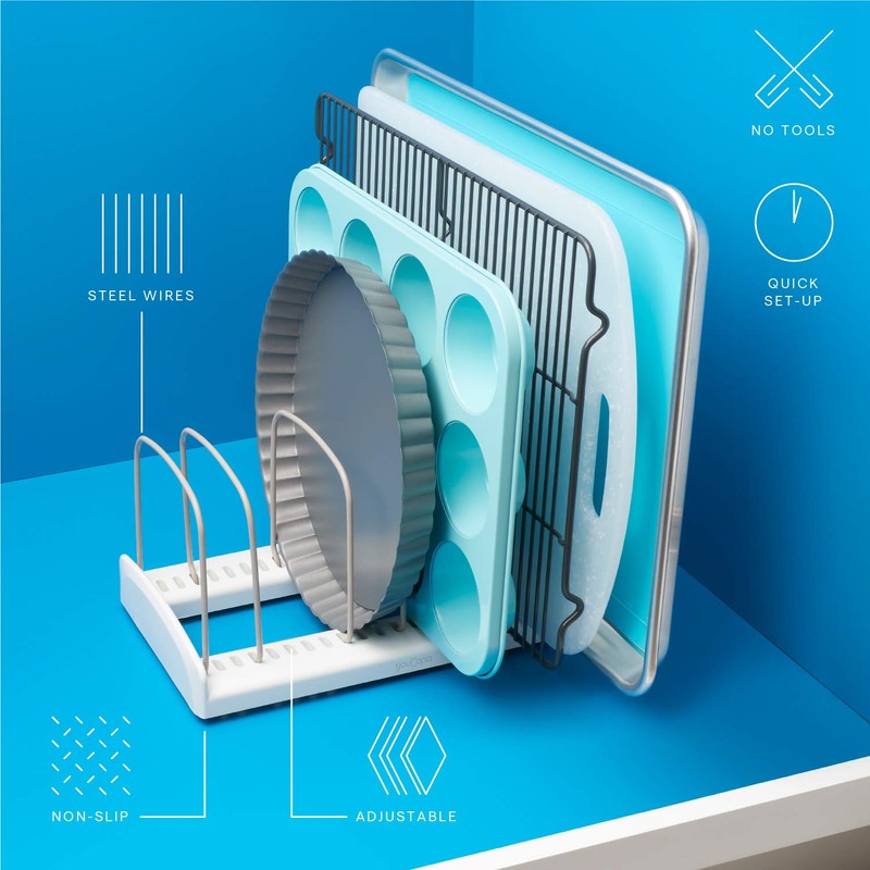 The Store more bakeware pan organizer cutting board organizer allows you to organize pans platters cutting boards and more in lower kitchen cabinets It features seven adjustable dividers to perfectly fit items so they remain upright and separated It's easy to grab one thing at a time! Coated steel wires won't scratch pans and soft feet hold everything in place No mounting or installation required.Sturdy base prevents round lids/pans from rolling