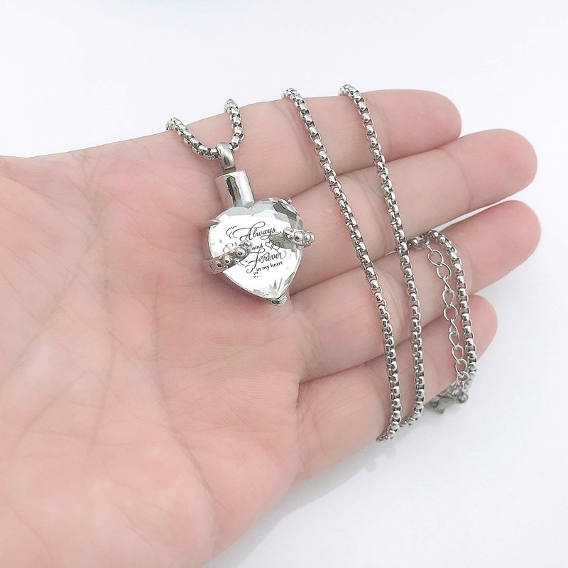 - ❤MATERIALS❤: Heart Shape Cremation Urn Necklace made of environmentally friendly material 316L Stainless Steel,Inlaid with Birthstone crystal, On the front it says:"Always on My Mind Forever in My Heart",and the back print:"I Love You to the Moon and Back" ,Stainless Steel,highly resisted to rust, corrosion and tarnishing, Sturdy and Durable.