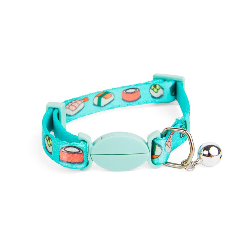 The Youly Aqua Soy Awesome SushiPrint Breakaway Cat Collar serves up a fresh, functional accessory showcasing a colorful sushi print on an adjustable nylon band. A breakaway closure opens when the collar is caught or pulled, and a polished bell sings a jingle helps you keep up with felines who are always on a roll.
