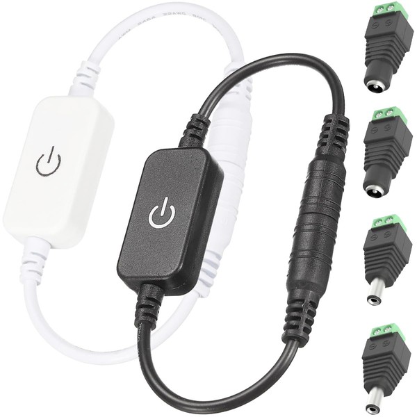 Youmile 2 Pack LED Strip Dimmer Switch, DC 12V-24V, LED Touch Inline Dimmer Tact Switch Controller, Black and White, with DC Plug and Socket for Single Color Emitting Diode Strips